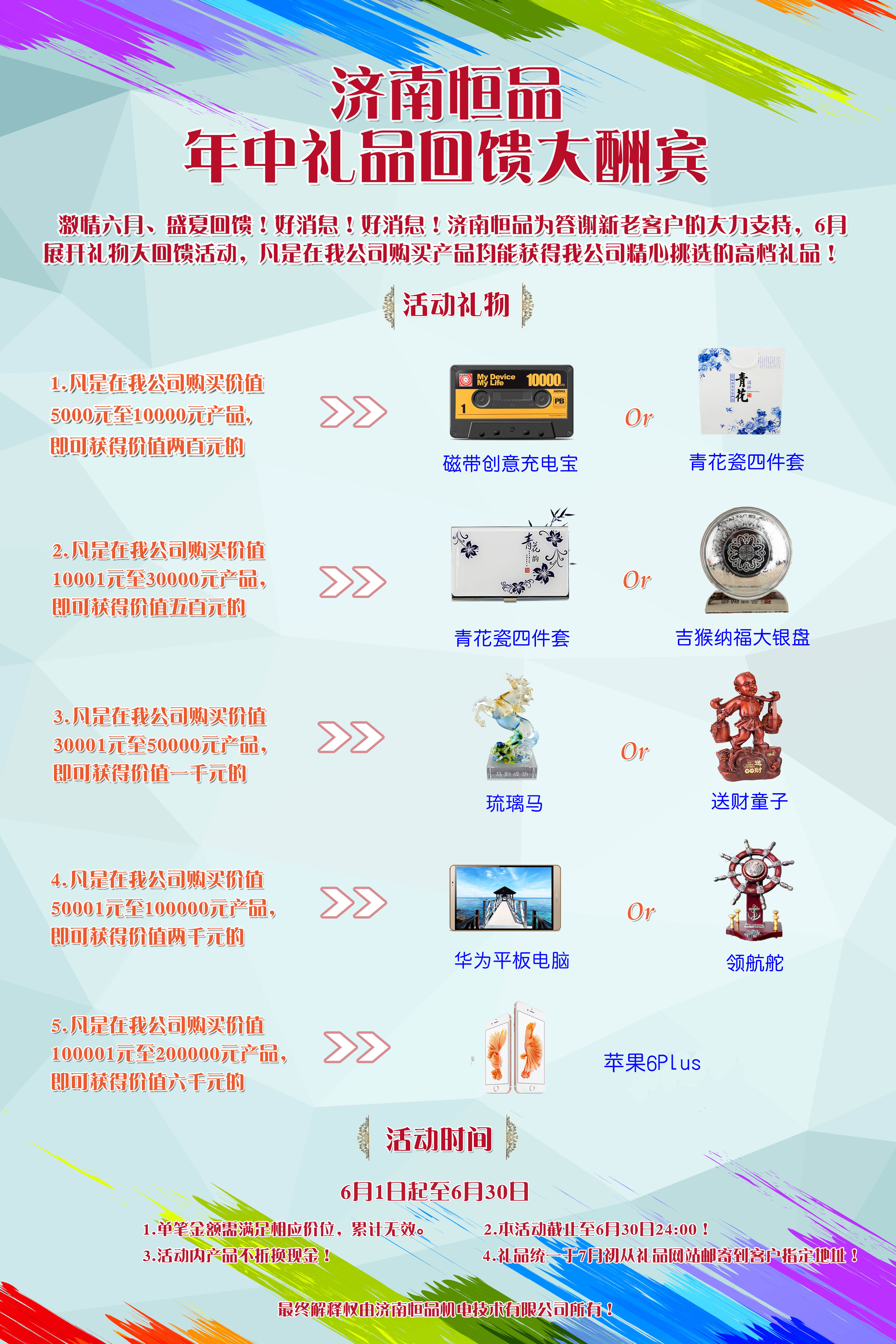 激情六月,盛夏回饋!好消息!好消息!濟南恒品為答謝新老客戶的大力支持,6月展開禮物大回饋活動,凡是在我公司購買產(chǎn)品均能獲得我公司精心挑選的高檔禮品!