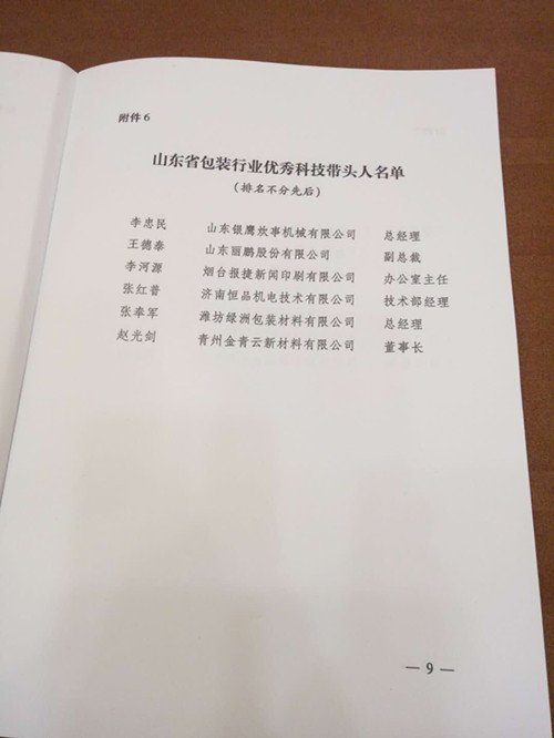 張紅普榮膺山東省包裝行業(yè)優(yōu)秀科技帶頭人稱號